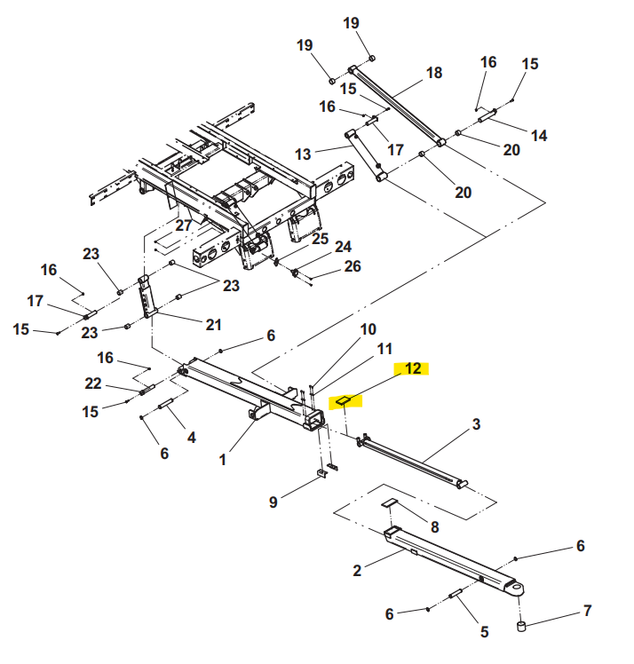 This wear pad fits in the inner tube of a carrier wheel lift as seen above in the breakdown. The dimensions of this wear pad are 0.38 X 3.00 X 5.94.