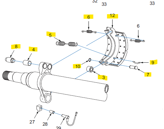 This kit is for 12.25 x 7.5 Drum Brakes on a Landoll trailer and includes shoes, shoe pins, springs, rollers, roller retainers, bushings, anchor pins, spring retainers, washer retainers, and an instruction sheet for quick reference. These can be seen above in the breakdown except the instruction sheet and washer retainers as they aren't displayed in the breakdown.