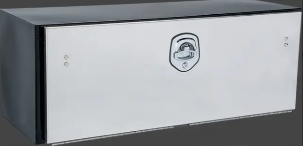 Black powder coated steel body with polished stainless-steel door with a compression latch.